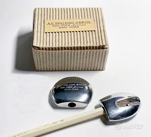 Serie di rari temperamatite A.G. Spalding & Bros 520 Fifth Avenue NY ormai introvabili in alluminio pieno in fusione A.G. che nascono in collaborazione con Artista Spacciatore loro progettista per questi e altri tipi di collezioni Questi temperini, prodotti negli anni novanta in stile tipico dell'Old America, sono realizzati interamente in alluminio pieno con l'antica tecnica artigianale della fusione a colata che crea alcune increspature e piccoli segni ma che rendono ogni articolo unico.