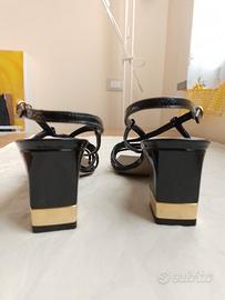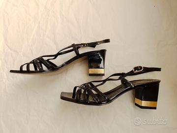 SPAZIOMODA Bologna sandali n.37 NUOVI, MAI usati, materiali di ottima qualità e pregiata fattura Made in Italy: tomaia in vera pelle verniciata colore nero, fodera e sottopiede in vera pelle nera, suola in vero cuoio, tacco largo a blocchetto alto cm.6 comodo, cinturino posteriore regolabile con fibbia.