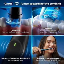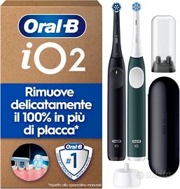 Oral-B iO 2 DUO Spazzolino Elettrico Oral B, Nero e Verde, 2 Testine Di Ricambio e Spazzolini, Custodia Da Viaggio, Porta Ricarica Da Viaggio. Delicato sulle Gengive, Sensore di Pressione DENTI 100% PIÙ PULITI rispetto ad uno spazzolino manuale tradizionale; Tecnologia iO di Oral-B: EFFICACE SULLA PLACCA, DELICATO SULLE GENGIVE PROGETTATO PER PASSARE ALL'ELETTRICO CON FACILITÀ; Basta un semplice per scegliere tra 3 livelli di intensità, spazzolamento silenzioso e batteria a lunga durata Proteggi le tue gengive con il SENSORE DI PRESSIONE AUTOMATICO che rallenta la velocità e ti avvisa con una spia rossa quando spazzoli i denti con troppa forza SCEGLI IN MODO FACILE LA TUA PULIZIA PERFETTA con 3 LIVELLI DI INTENSITÀ SILENZIOSI: Super Delicata, Delicata, Pulizia Quotidiana TIMER DI 2 MINUTI, COME CONSIGLIATO DAL DENTISTA, che ti avvisa ogni 30 secondi per cambiare la zona di spazzolamento