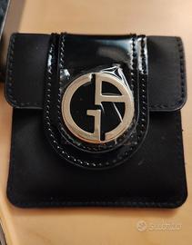 Elegante specchietto da borsa Giorgio Armani. Nuovo, nella sua confezione originale. Sul marchio della bustina ancora presente plastica di protezione sul marchio di metallo. La busta porta specchio misura 9.5 x 9 cm.