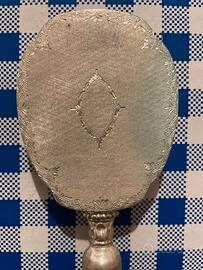 Antico specchietto da borsetta in argento 800 cesellato, con portacipria e portarossetto.