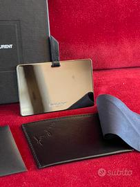 specchietto da borsa Yves Saint Laurent originale, in finitura metallica lucida color argento con incisione