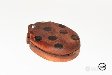Specchietto da borsa coccinella portafortuna in legno di platano rosso,pois in wengè e cornice specchietto in noce; gli occhi della coccinella sono 2 punti luce.