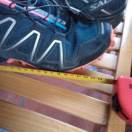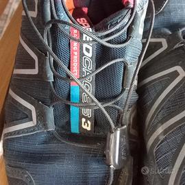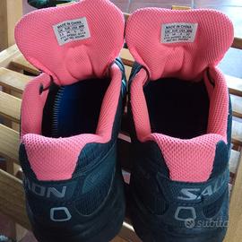 Scarpe donna Salomon modello Speedcross 3, ideali per lo sport/ running su terreni fangosi e tecnici. Nylon blu scuro con profili grigio, suola e interno rosa pink. Misura EUR 36 Ottimo stato, fornite senza la soletta interna e in scatola di scarpe generica altro brand. Valuto la vostra piu ragionevole offerta.