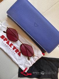 Occhiali da sole originali,forma a rombo con montatura oro e lente burgundy venduti con la sacca porta occhiali, contenitore e pezza in microfibra per la pulizia delle lenti, tutto marchiato.
