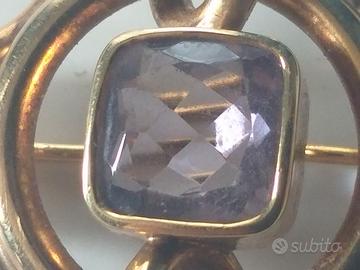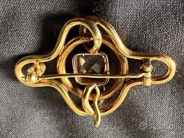 Elegantissima spilla del Novecento, in oro 18 carati (punzonato), realizzata artigianalmente con grande maestria. La spilla è impreziosita da un’ametista chiara, dai toni lilla. Trattasi di un gioiello ideale anche per ragazze più giovani, di grande fascino. MISURE: 44 mm x 30 mm Le foto rappresentano il bene così come venduto. Si garantisce sulla lecita provenienza del bene. Molto ben conservata, con una piccola ammaccatura poco visibile. L'oggetto non essendo venduto a peso va acquistato per le sue caratteristiche artigianali/artistiche/storiche. Si prega di accertarsi precedentemente dell'interesse per il bene. Si spedisce unicamente con assicurata.
