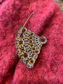 spilla ha un design a ventaglio ornato con dettagli in filigrana color oro anticato, che le conferisce un aspetto elegante e vecchio stile.