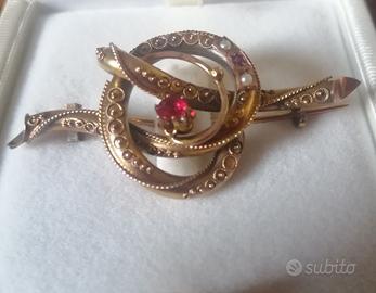 Antica spilla in oro 9k,nodo d'amore. Microperle e pietre.