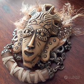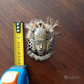 Spilla molto particolare, antica, proveniente dal Texas, raffigura il volto di un nativo americano, con piume reali. Il materiale sembra resina comunque è molto duro con incisioni ben realizzate, il retro potrebbe essere argento ma non trovo il timbro...però di bella fattura. Il pendente in avorio o corno di animale. In ottimo stato.