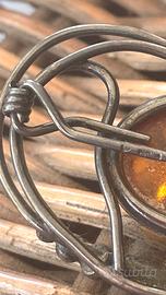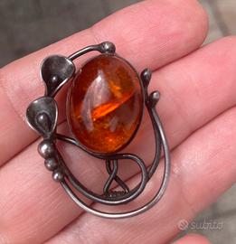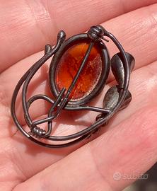 Bellissima spilla artigianale in argento sterling 925 con un grande cabochon di ambra naturale dai riflessi caldi e luminosi. Il design è ispirato allo stile Art Nouveau, con motivi floreali eleganti che ricordano delle calle in fiore, lavorati con grande attenzione ai dettagli. Mis cm 3,5 x cm 2,5.