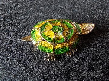 Bellissima spilla vintage in filigrana d'argento 800, arricchita da doratura e smalti colorati.