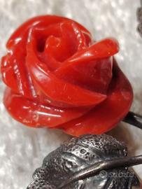 Bellissima e antica spilla in argento 800 con corallo rosso di Sardegna intagliato a mano dai maestri incisori di Torre del Greco a forma di rosa In perfette condizioni nonostante l'età Disponibile per altre foto I miei annunci sono pubblicati anche altrove
