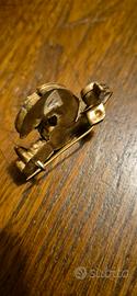 Spilla di design a forma di galletto in metallo e decorazione smaltata rossa simile corallo. Dimensioni cm.3x3