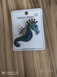 Bellissima spilla cavalluccio marino molto luminosa adatta a qualsiasi abbigliamento,sui toni dell' azzurro.