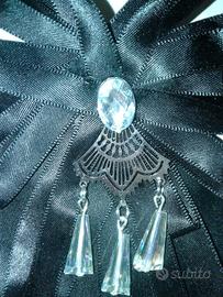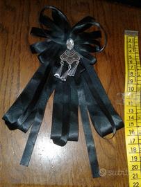 Spilla/coccarda stile gotico in cristalli, metallo, raso e plastica; ottime condizioni, poco usata.