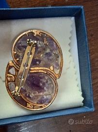 Splendida spilla vintage in stile antico con ametiste viola naturale, non trattate, con punti di fantasia diversi, dal viola intenso- in alcuni punti scuro- come ho cercato di evidenziare in foto, al viola più tenue. Non ho in alcun modo ritoccato le foto al fine di mettere in evidenza la naturalezza e bellezza del gioiello. L'ametista è montata su vetro ed è bordata di metallo dorato non meglio identificato, forse bronzo dorato molto bello e lavorato. Nel retro, dove c'è il vetrino su cui è montata l'ametista sono presenti due targhette di punzonatura, come a voler dare un'identità alla spilla: in una di queste targhette sembrano essere presenti simboli, che però non riesco a decifrare. la chiusura o apertura è a spilla classica. La spilla è in eccellenti condizioni con lievi segni legati al tempo ed all'età. Per questo oggetto utilizzerò packing adeguato e spedizione assicurata ed espressa con corriere affidabile, come per ogni mio lotto.