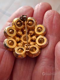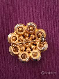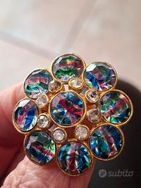 Bellissima spilla antica a forma di fiore con strass di cristalli 'Aurora Boreale'. misura diametro cm 3 ,5 peso g. 15. Risale agli anni 50. Come si vede da foto è in perfette condizioni.