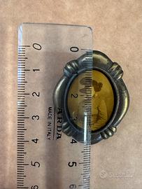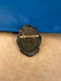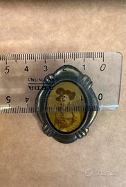 Spilla con foto Vintage che ritrae una donna, vestita con tipico abbigliamento degli anni ‘30. È in color seppia anticato. Misura 4 x 3,5 cm.