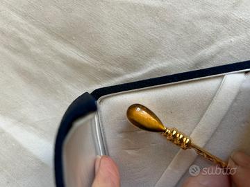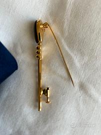 Bellissima spilla di metallo con pietra "occhio di tigre", chiusura perfetta. In astuccio di pregio come da fotografia. Per dimensioni e fattura è adatta al bavero della giacca, su un abito, ma anche come ferma cravatta. Lunghezza 7,5 cm.