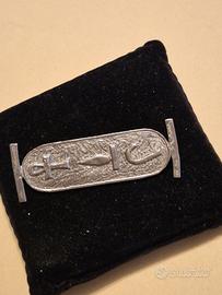 Questo oggetto in argento 800 è una spilla a forma di cartiglio egiziano