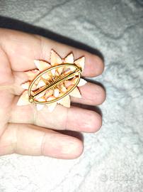 La spilla è montata su struttura in metallo dorato (non oro), con chiusura a spilla funzionante.