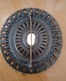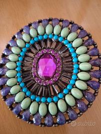 Spilla rotonda coloratissima, prevalentemente verde e viola, con pietra viola chiara circondata da brillantini incastonata al centro, ottime condizioni
