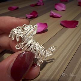 Scondinzola ma non abbaia… C’è qualcosa di tenero e deciso insieme in questa piccola figura d’argento. Un cagnolino colto in una posa quasi vigile, costruito interamente con fili sottilissimi di argento intrecciati uno a uno, come se la materia fosse stata disegnata nell’aria. La filigrana italiana dà vita al corpo con un ritmo leggero, fatto di curve, pieni e vuoti, che lasciano passare la luce e alleggeriscono la forma. Non è un semplice soggetto decorativo: è un esercizio di pazienza e mano ferma, dove ogni dettaglio — dalle orecchie alla coda — è risolto con equilibrio e grazia. Indossata su un cappotto, su una giacca o appuntata a una sciarpa, questa spilla aggiunge una nota discreta ma riconoscibile, capace di parlare a chi ama gli oggetti curati, autentici, curiosi ed eleganti insieme. È uno di quegli accessori che si notano per la loro originalità, e proprio per questo restano impressi.