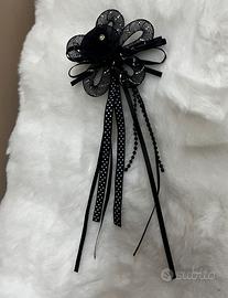 Elegante spilla artigianale multifilamento, caratterizzata da un design stratificato e materiali misti che creano un accessorio dinamico e di grande impatto visivo. Ideale per decorare il bavero di una giacca, una camicia con colletto alto o come chiusura per uno scialle. Presenta un fiore centrale realizzato in rete metallica nera intrecciata con fili argentati, con un punto luce centrale (strass) che cattura la luce. Elementi Pendenti: Una cascata di nastri diversi che include: Nastro in gros-grain nero a pois bianchi; Nastri sottili in raso nero lucido; Fili di perline nere (tipo catenella) per un effetto gioiello. Perfetto per estetiche Dark Romance, Gothic, o per completare look formali con un tocco originale. Colore: Nero profondo con dettagli argento e bianchi. Chiusura con spilla classica di sicurezza. Nuova, mai usata.