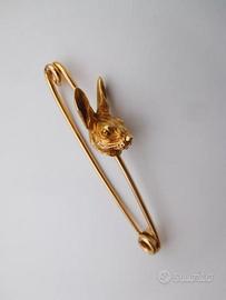 Importante spilla per spilla con maschera di coniglio pasquale in oro 18 carati vittoriano francese in stile Art Nouveau! Testa di aquile parziale completamente marchiata sul perno e i produttori contrassegnano EQ con un'ancora tra le iniziali nel tradizionale campo di diamanti francese per la scultura e il gioielliere francese Eugène Quinton della fine del XIX secolo, circa 1890. Pesa circa 8,4 grammi. L'intero pezzo è lungo circa 5,6 cm (2 3/16 pollici), con la dettagliata maschera di coniglio alta circa 1,75 cm (10,5/16 di pollice) dalle punte delle orecchie al collo dalla prospettiva frontale del viso. La larghezza dalla sezione dell'orecchio più larga è di circa 1,2 cm (7,5/16 di pollice) dalla curvatura verso l'esterno dell'orecchio sinistro alla curva verso l'esterno dell'orecchio destro. Sul lato della spilla è inciso "CARNAVAL DE VENISE" che indica che si tratta di un gioiello personalizzato creato per il carnevale di Venezia.