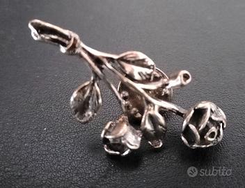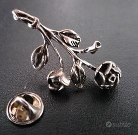 Elegante spilla a forma di rosa in argento. Design floreale dettagliato. Finitura lucida. Nelle 2 foto sono raffigurati, nei due versi, il gancio-fissatore ideale per essere applicato su giacche, cappotti ed altri indumenti femminili.