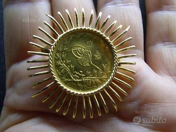 Magnifica spilla in oro giallo, con raggi solari semplici ed eleganti, al centro moneta in oro araba?, chiusura con blocco di sicurezza.