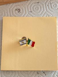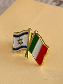Spilla con le bandiere di Israele e italiana. Sia per giacca che da attaccare a superficie metallica visto che vi sono due calamite che permettono di attaccarla ovunque