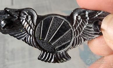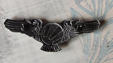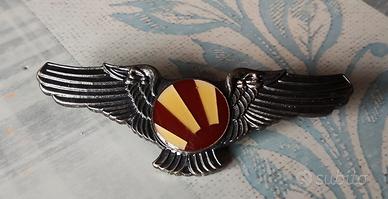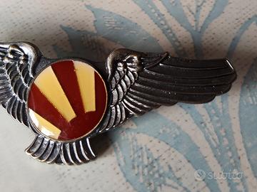 Distintivo metallico, aviatorio storico. Design: Presenta un'aquila stilizzata con ali spiegate e un cerchio centrale smaltato con raggi, simile a un sole nascente. Retro: Mostra i perni di fissaggio per essere indossato su un'uniforme o un abbigliamento. #distintivi #distintivomilitare #aviazionemilitare #aviazione #distintivianni50 #anni50 #distintivimilitarianni50 #militarevintage #militare