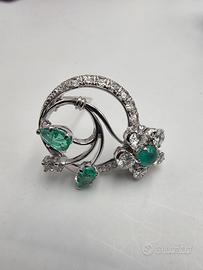 Meravigliosa spilla in oro bianco 18 carati con 5 diamanti naturali come petali sul fiore da 0,50 carati totali, 10 diamanti di taglio brillante e misura diversa da 0,30 carati, 1 diamante di taglio ovale da 0,03 carati, 2 smeraldi naturali da 0,7 carati taglio a goccia e 1 di taglio cabochon da 0,25 carati.