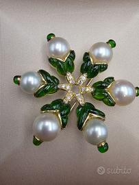 Bellissima spilla portabile come pendente con 6 perle naturali giapponesi Akoya da 9 millimetri di diamentro, 6 smeraldi taglio cabochon, 6 smeraldi taglio briolette di caratura totale 7,8 e 24 diamanti totali di 0,30 carati.