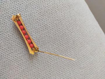 SPILLA ORO GIALLO 750 E CORALLO, PESO 3,73 GR, LUNGHEZZA 3,8CM