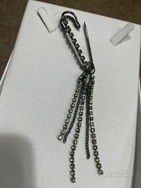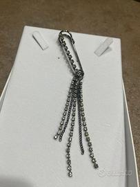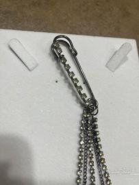 Splendida spilla a forma di spilla da balia, arricchita da dettagli luminosi. Un accessorio versatile, perfetto sia per uno stile punk-chic che per impreziosire un look elegante. Dettagli del Prodotto: * Design: Struttura a spilla da balia in metallo brunito/canna di fucile. * Decorazioni: Profilo superiore interamente rivestito di punti luce (strass). * Pendenti: Cinque catenelle sottili alternate (alcune con strass, altre in metallo liscio) che creano un bellissimo movimento. * Stile: Vintage / Glam Rock / Minimal ricercato. Lunghezza totale della spilla: circa 5-6 cm. Lunghezza massima dei pendenti: circa 7-8 cm. Ideale da appuntare su un blazer oversize, su un cappotto scuro per farlo risaltare, o per chiudere in modo originale un cardigan in lana grossa. Bellissima anche applicata su un berretto o una borsa in tessuto. In ottime condizioni, tutti i brillantini sono presenti e la chiusura è perfettamente funzionante. spedizione rapida 📦 #spilla #vintage #strass #glamrock #gothic #gotic #punkchic #accessoriovintage #spillabalia #brillantini #darksilver #chic #jewelry #vinteditalia #vintedfrance #spilladonna #bijoux #anni90 #Y2K #gotica #balia #regalo #serata #giacca #particolare #accessori #stravagante