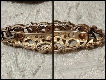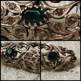 Bellissima spilla anni 30 in argento 800 bagnato in oro con cristalli taglio smeraldo e bianchi