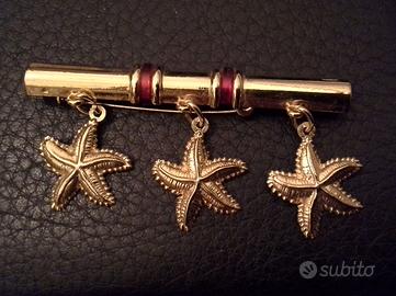 Spilla vintage di alta bigiotteria stile Art Deco composta da asticella imitazione bamboo dì 6 cm con tre stelle marine pendenti lavorate in rilievo. Perfetta fronte retro, con due striscette rosse portafortuna. Potrebbe essere usata anche come ferma cravatta o ferma foulard.