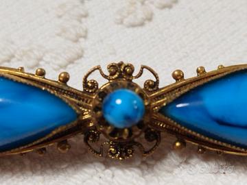 Spilla di manifattura artigianale spagnola realizzata negli anni '60 - stile vittoriano - in bronzo dorato, ben rifinita, con due pietre grandi e una piccola di colore turchese, come da foto - dimensioni: 8 cm. di lunghezza.