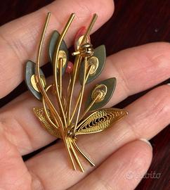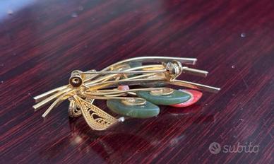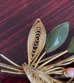 Spilla vintage a forma di bouquet floreale con dettagli in filigrana dorata, fiori e boccioli in corallo e spille in giada. Chiusura con sicurezza. #spillavintage #spillafiligrana #corallo #giada #spilla #vintage #regalodinatale