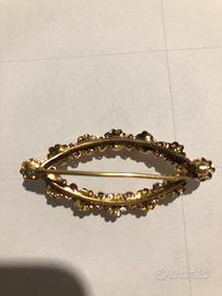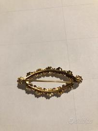 Spilla Vintage anni 50 in oro 18 kt. Peso 10.5 g. Punzonatura andata via col tempo. Peso oro almeno 8 g. Disponibile video con test dell’acido su pietra. Preferibile consegna a mano. Prezzo non trattabile. Piccoli segni di usura dovuti all’ epoca ma con una lucidata torna nuova.