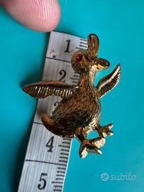 Spilla vintage Made in Italy in metallo dorato raffigura un’anatra / paperella occhio brillantino rosa tipo rubino.