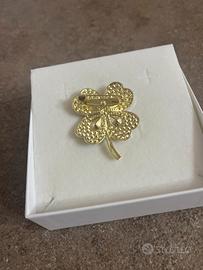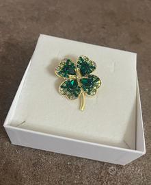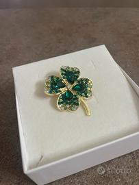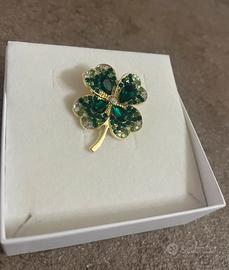 Spilla vintage Quadrifoglio dorata cristalli verdi