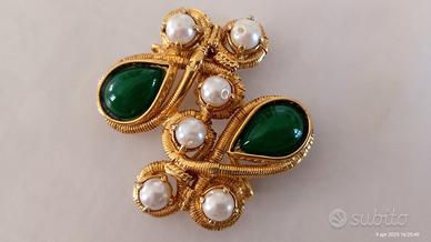 Spilla vintage a forma di rosone dorata alta bigiotteria pietre verdi perle