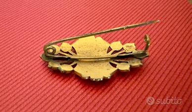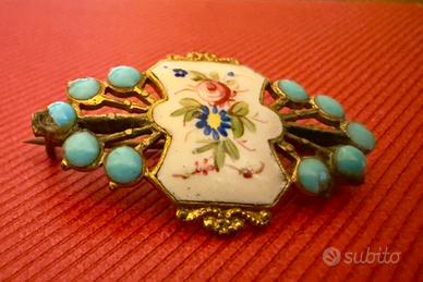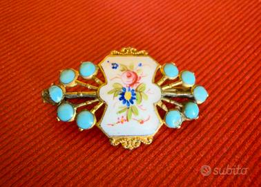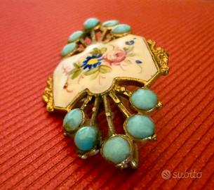 spilla da bavero vintage in stile vittoriano o revival, caratterizzata da smalti dipinti a mano con motivi floreali e cabochon turchesi (uno danneggiato). Decorazione: Smalto bianco con disegno centrale di fiori policromi. 10 Cabochon turchesi disposti a ventaglio sui lati. Misure 35 x 20mm.