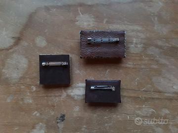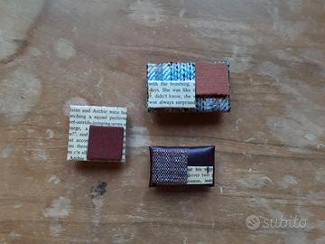 Spille realizzate con bottoni rivestiti di stoffa e ritagli di vecchi libri destinati al macero. Tutto cucito a mano con una macchina da cucire anni Trenta. Realizzabili anche su richiesta.