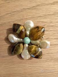 Magnifiche perle naturali, piastrine e gocce. Al centro c'è l'amozanite naturale. Fatto a mano. La serratura funziona. Nuovo. Dimensioni del fiore 3,5 x 3,3 cm. Con gocce da 3,5 x 4,5 cm. Prezzo 39 euro;
