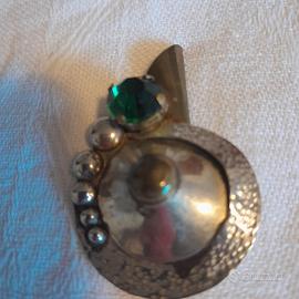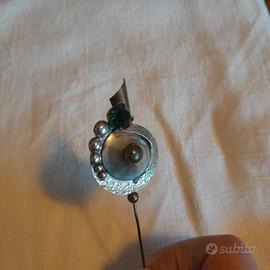 spillone per cappotti, cappelli, gonne, origine asiatica, anni 60/70 con pietra dura verde lucidissima. il materiale potrebbe essere, acciaio, alpaca o argento. lunghezza cm 11, larghezza cm 2,5. oggetto vintage/,modernariato
