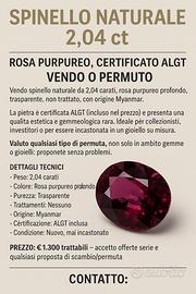 Vendo spinello naturale da 2,04 carati, rosa purpureo profondo, trasparente e non trattato, con origine Myanmar. La pietra è corredata da certificato ALGT (incluso nella vendita) che ne garantisce autenticità e caratteristiche gemmologiche.